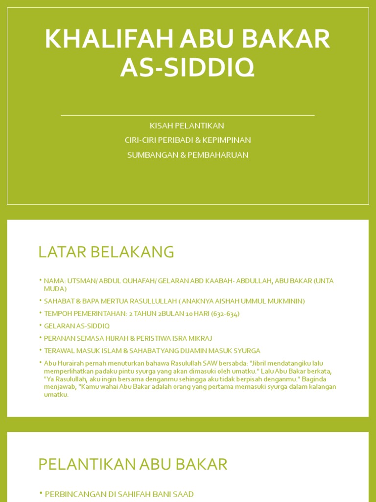 Abu Bakar memimpin umat Islam selama dua tahun dari 632-634 M 11-13 H. KHALIFAH ABU BAKAR AL-SIDDIQ Terdapat permasalahan sewaktu pelantikan khalifah pertama berikutan kewafatan Nabi. Video kali ini membincangkan tajuk Keunggulan Perjuangan Khulafa Ar-Rasyidin dalam subjek Pendidikan Islam tingkatan 1.